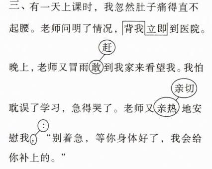 有一天上课时,我忽然肚子痛得直不起腰。老师问明了情况,背我立即到医院。晚上,老师又冒雨敢到我家来看望我。我怕耽误了学习,急得哭了。老师又亲热地安慰我,“别着急,等你身体好了,我会给你补上的。”