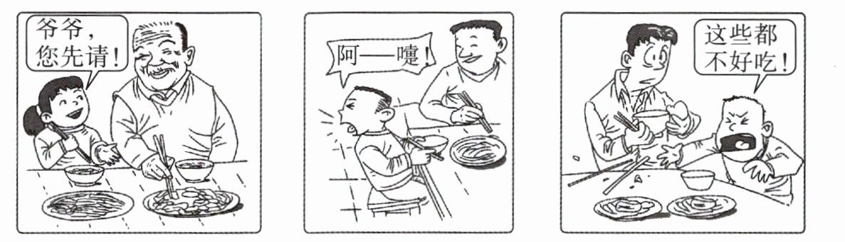 )2. 观察下面的漫画,根据《餐桌上的“老规矩”》(节选)和下面的提示,在横线上补充人物的身份和语言。