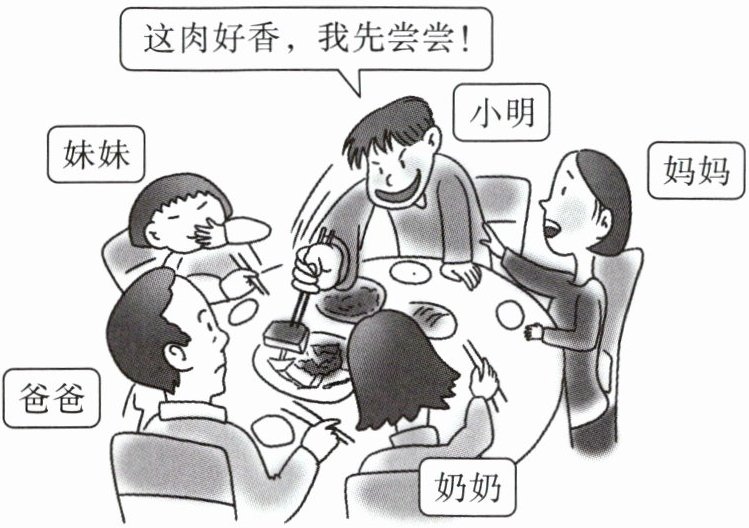提示:(1)看到这个场景,想想小明的家人会说什么,怎样说。他们是友好地劝说,是幽默地提醒,还是严肃地批评?