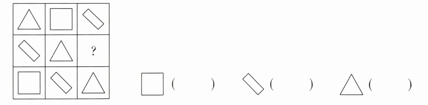 五、每种图形的个数相同,“?”处是哪个图形?请在正确图形后面的( )里画