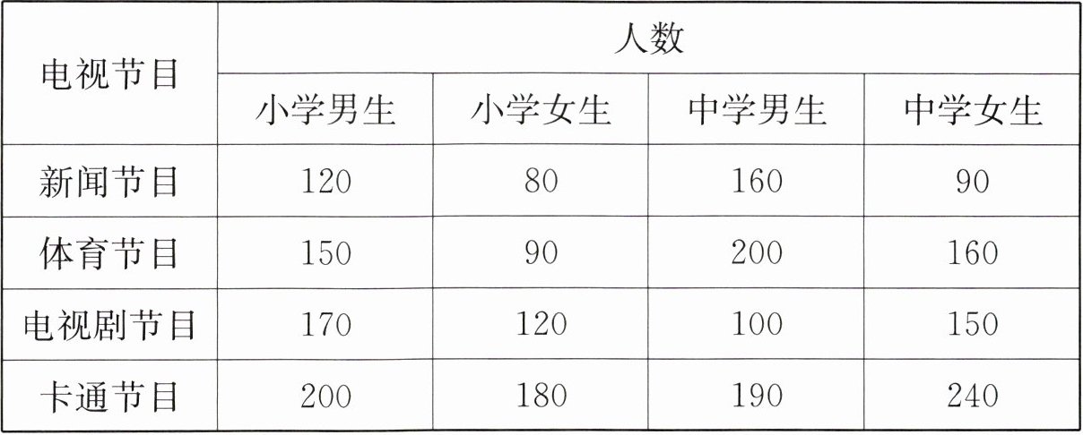 (2)在小学女生中,喜欢()节目的人最多;在中学男生中,喜欢()节目的人最少。