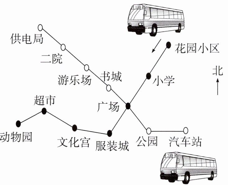 (2)2路车从汽车站出发,先向()行驶到公园,再一直沿()方向到达供电局。