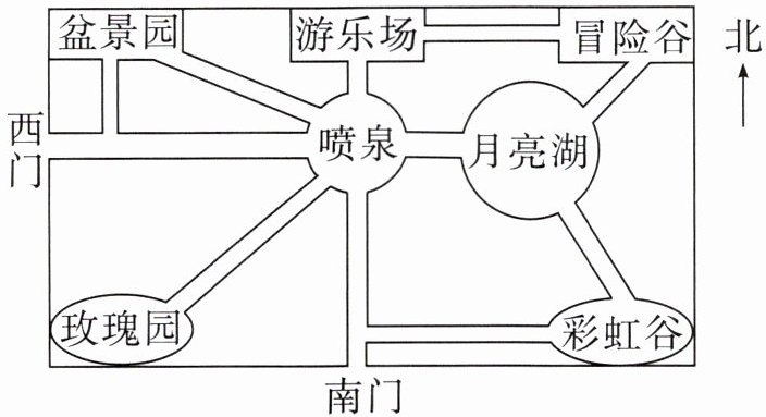 (3)从西门到冒险谷:可以先向()走到喷泉,再向()走到游乐场,最后向()走到冒险谷;也可以先向()走到喷泉,再向()走到月亮湖,最后向()走到冒险谷。