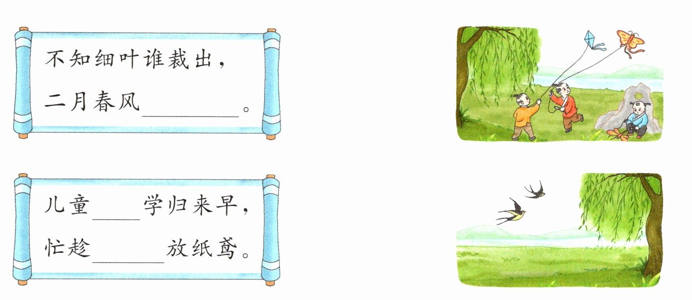 4. 先把诗句补充完整,再想象诗句描绘的画面,将诗句与对应的图片连起来。