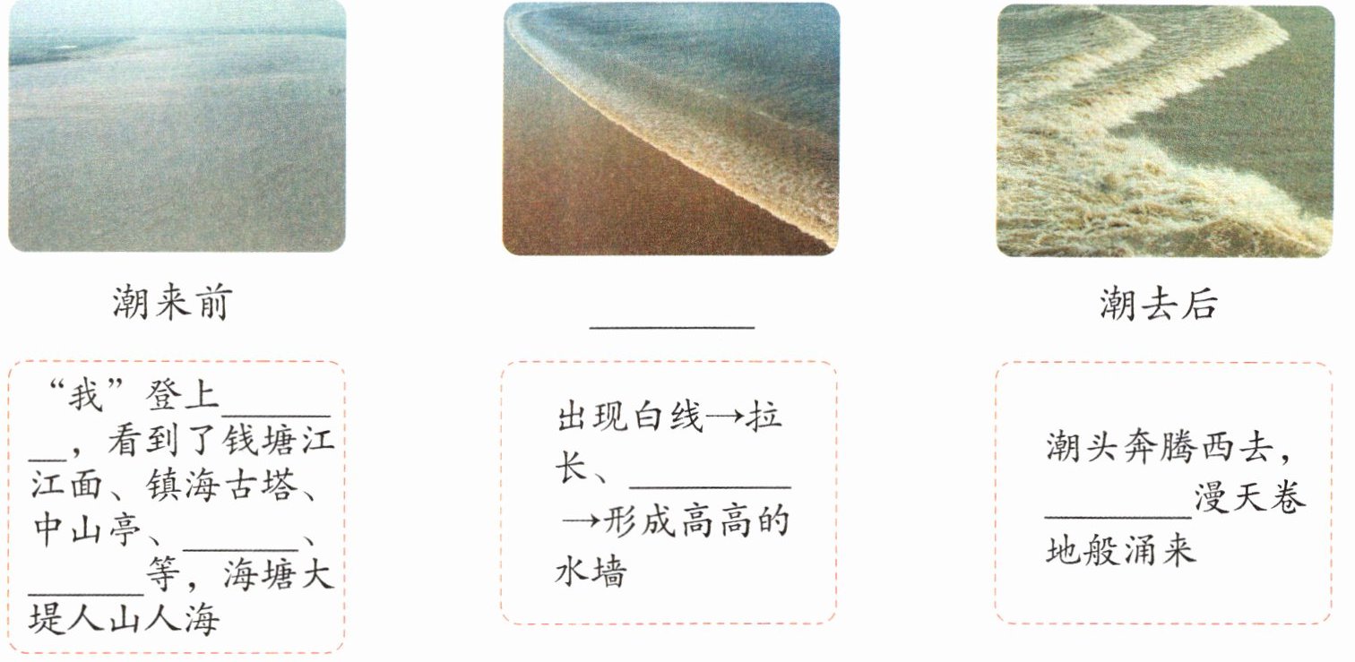 午后一点左右,从远处传来隆(lóng)隆的响声,好像闷雷滚动。顿时人声鼎(dǐng)沸(fèi)②,有人告诉我们,潮来了!我们踮(diǎn)着脚往东望去,江面还是风平浪静③,看不出有什么变化。过了一会儿,响声越来越大,只见东边水天相接的地方出现了一条白线,人群又沸腾起来。