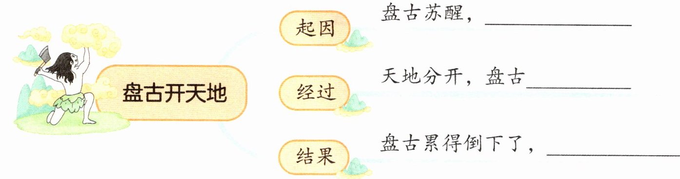 很久很久以前,天和地还没有分开,宇宙混(hùn)沌(dùn)①一片,像个大鸡蛋。有个叫盘古的巨人,在混沌之中睡了一万八千年。