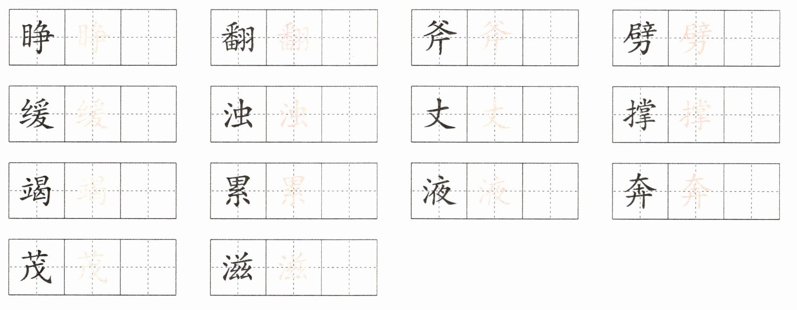 @@书写要点:左右结构的字“睁、缓、浊、撑、竭、液、滋”均为左窄右宽,需要注意的是“缓”右半部分不是“爱”;“斧、劈、累、奔、茂”为上下结构的字,书写时注意两部分的不同比例,其中“累”字的下半部分比“系”少一撇。
