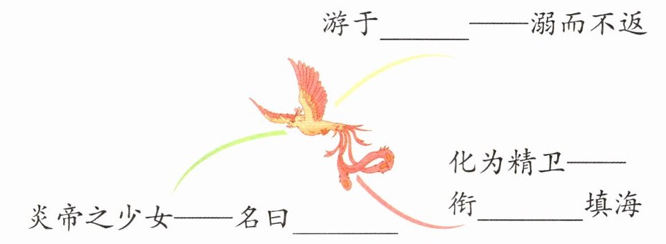 炎帝②之少(shào)女③,名曰(yuē)女娃。女娃游于东海,溺(nì)④而不返(fǎn),故⑤为精卫,常衔西山之木石,以堙(yīn)⑥于东海。