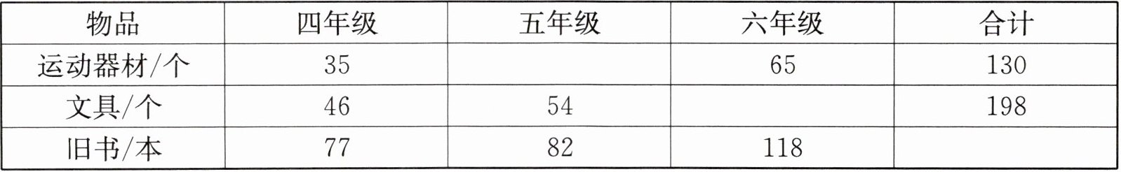 3. 某小学准备捐赠若干物品给“希望工程”,下面是四、五、六三个年级捐赠的物品统计情况,请把表格填写完整。