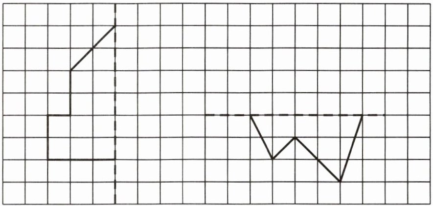 1. 按照上述方法画出两个轴对称图形的另一半(由于无法直接绘制图形,学生可根据原理自行完成)。