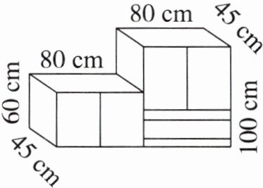 3. 一种组合连体高低柜是由一个长为80cm、宽为45cm、高为60cm的长方体和一个长为80cm、宽为45cm、高为100cm的长方体组合成的(如图)。油漆工要给这个高低柜刷油漆,前后面刷浅黄色,其他露出部分都刷油绿色。刷浅黄色和油绿色的面积各是多少平方米?