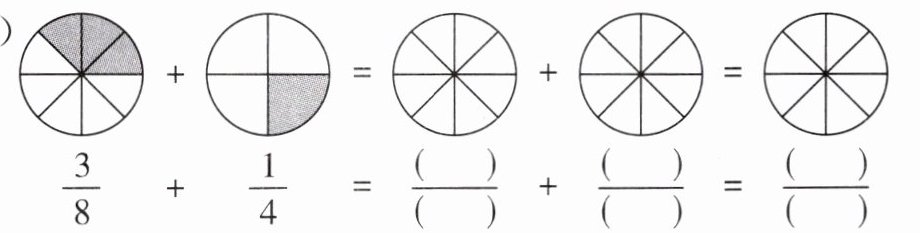 $\frac{3}{8}+\frac{1}{4}= \frac{()}{()}+\frac{()}{()}= \frac{()}{()}$