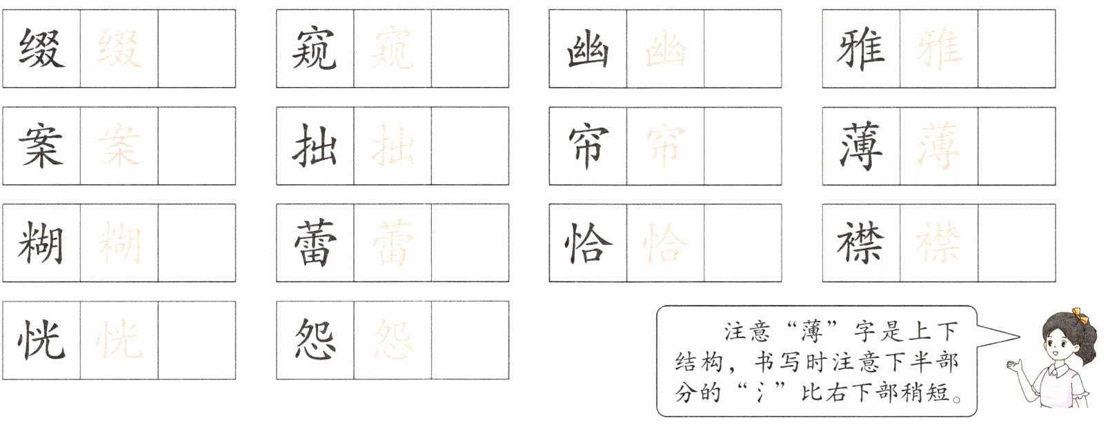 2. 书写要点:“幽”字为半包围结构,书写顺序是先内后外,先写中间一竖,再写两个“幺”字,最后写外面的竖折和竖;“缀”字右半部分的前三个“又”注意变捺为点。