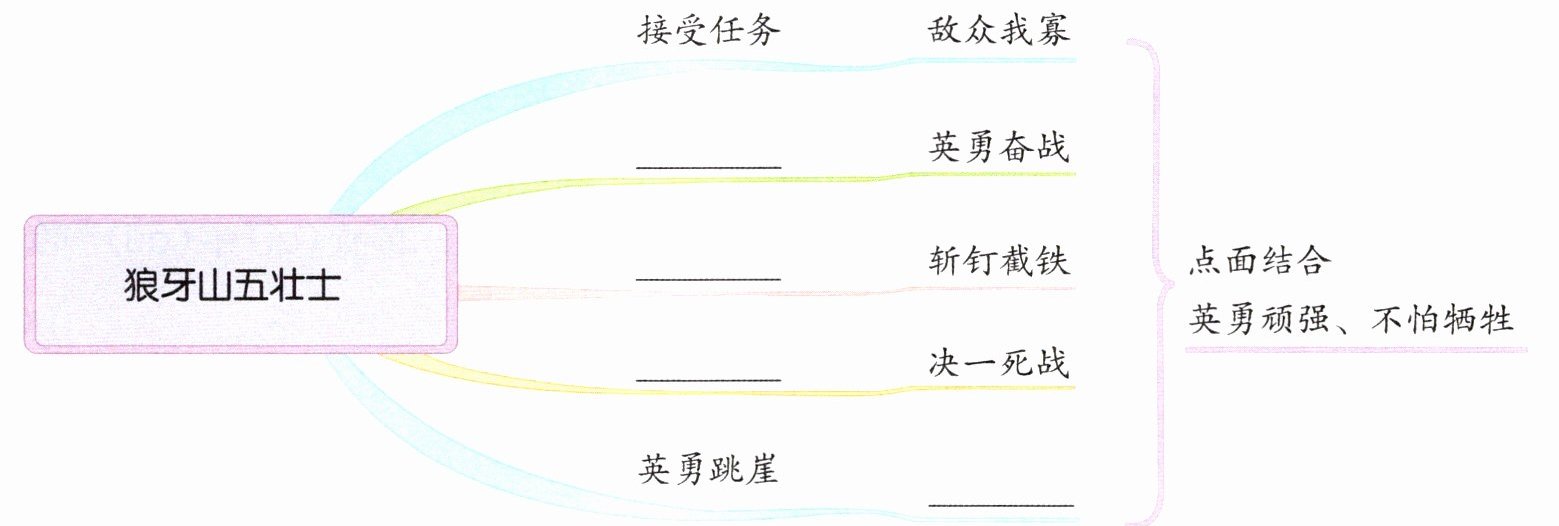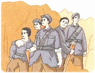 五位壮士屹立在狼牙山顶峰,眺望⑤着群众和部队主力远去的方向。他们回头望望还在向上爬的敌人,脸上露出胜利的喜悦。班长