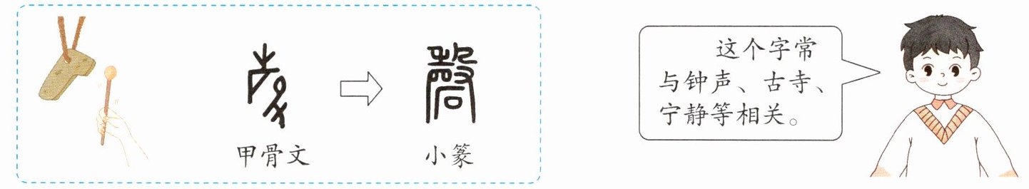 (1)甲骨文的字形是手持槌敲击一个形似曲尺的乐器,小篆字形加“石”,因为此乐器多是用石或玉制成的。结合课文和图示,我猜测这个字是