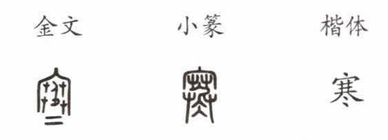 “寒”的金文字形中,外面是一个房子,屋子的中间是瑟瑟发抖的“人”,他的脚下踩着两块冰,意思是寒从脚起;“人”的四周都是草,表示在屋子内铺草御寒。
