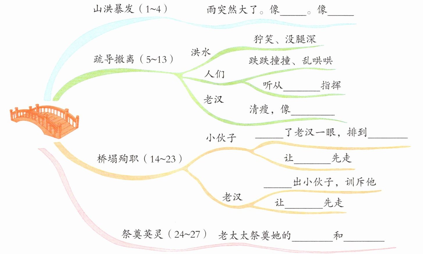 突然,那木桥轰的一声塌了。小伙子被洪水吞没了。