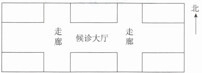 按照上述分析将相应科室名称填入医院平面图的对应位置即可(由于无法直接绘制图形,学生可根据文字描述在给定平面图中准确填写:挂号处填在候诊大厅上方空格;交费处填在候诊大厅下方空格;骨科门诊填在候诊大厅右上方空格;内科门诊填在候诊大厅左下方空格;儿科门诊填在内科门诊上方空格;外科门诊填在候诊大厅右下方空格)。