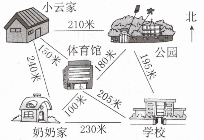4. 小云从奶奶家出发去公园,最近的路长多少米?