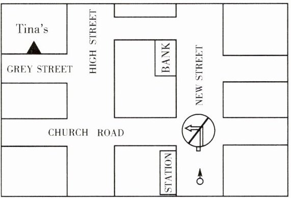 Tina 邀请 Jenny 去她家,Jenny 接受了邀请。但 Jenny 不知道去她家的路,所以 Tina 写信告诉她。根据上下文及图示填空,每空一词。