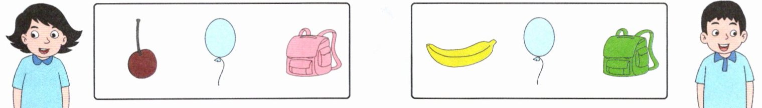 Yang Ling: Look at my cherry/balloon/bag. It's red/blue/pink. It's nice. Liu Tao: Look at my banana/balloon/bag. It's yellow/blue/green. It's nice.