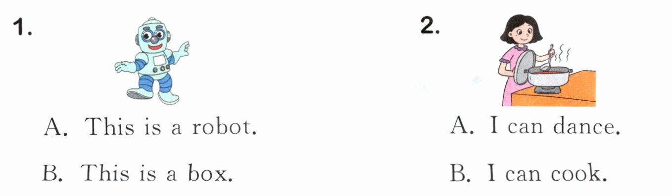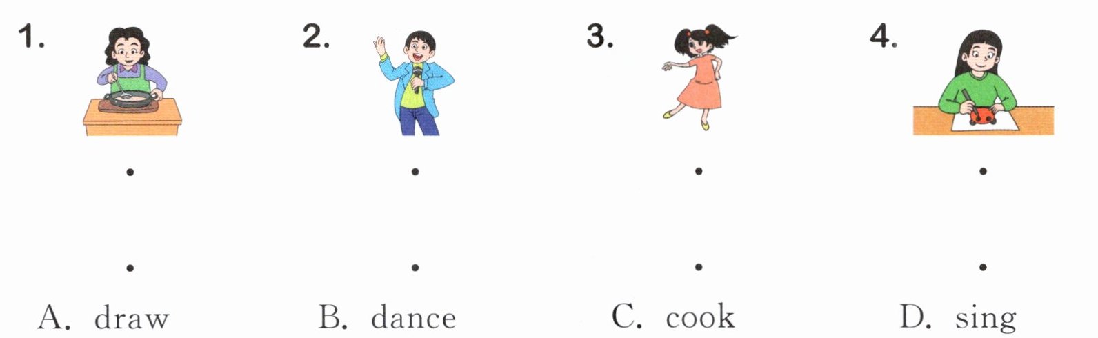1. C 解析:sing 与 cook 是动词,Miss 是对人物的尊称。2. A 解析:dad 与 mum 是人物类名词,robot 是物品类名词。3. C 4. A 解析:draw 与 dance 是行为动词,can 是情态动词。