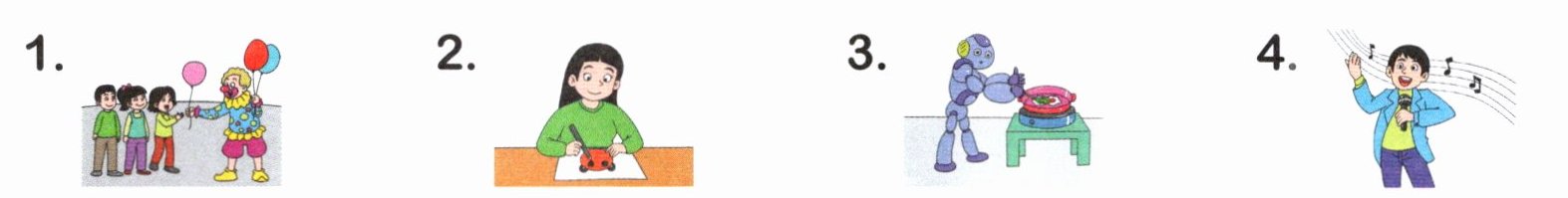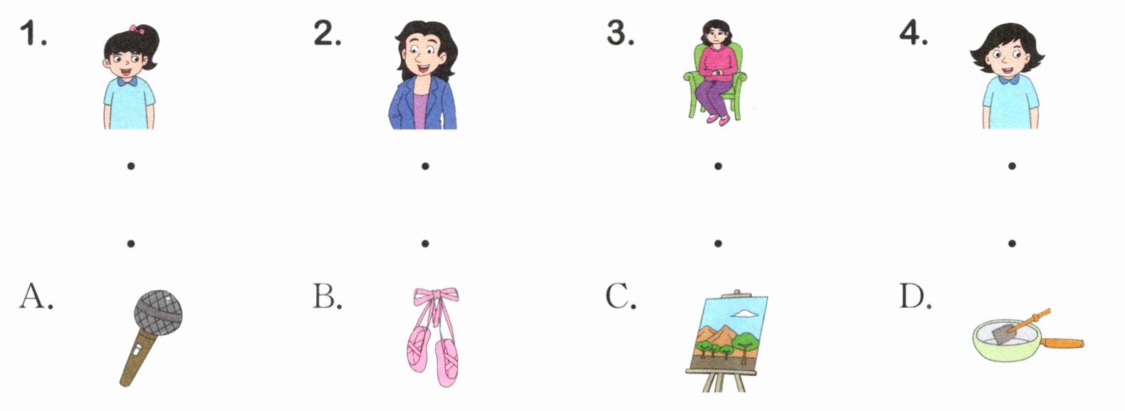 (1. C 2. A 3. D 4. B)解析:选项 A 的话筒对应 sing;选项 B 的舞蹈鞋对应 dance;选项 C 的画对应 draw;选项 D 的锅铲对应 cook。