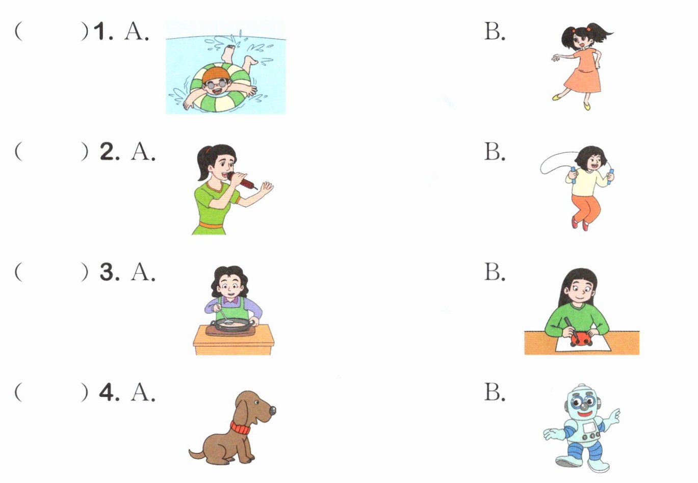 1.☺ 2.☹ 解析:听力内容是“I can dance,my good friend.”,意为“我会跳舞,我的好朋友”,与所给中文句子不符。3.☺ 4.☹ 解析:听力内容是“Is this a puppy?”,意为“这是一只小狗吗?”,与所给中文句子不符。