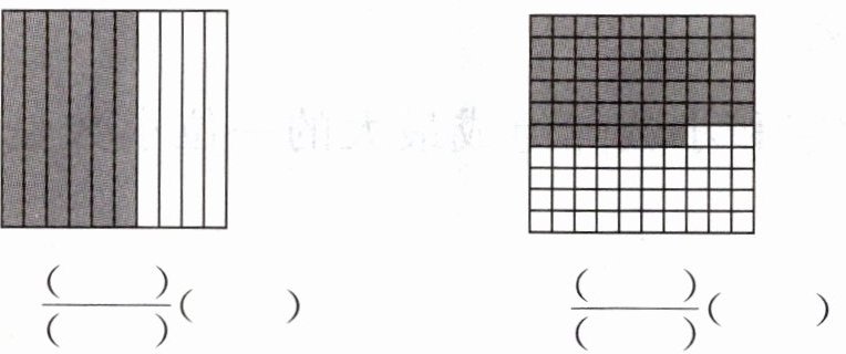 1. 下面每个图形都表示整数“1”,把图中的涂色部分分别用最简分数和小数表示出来。