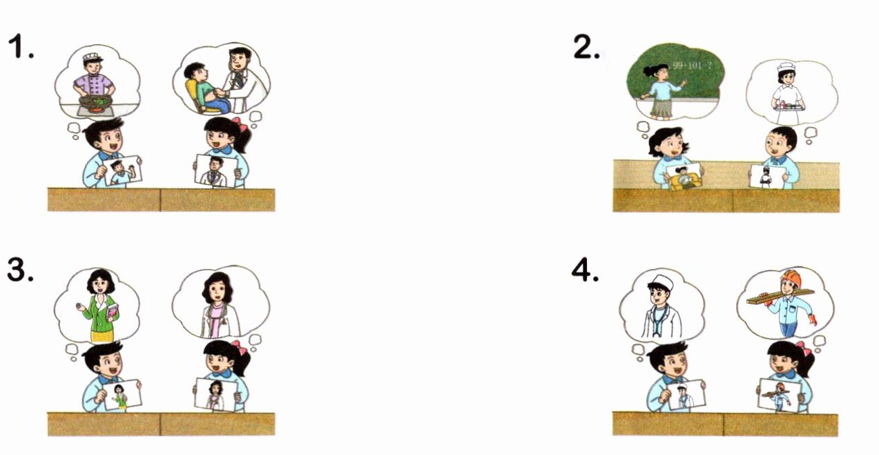 1. — This is my dad. He's a cook. — My dad is a doctor. 2. — This is my mum. She's a teacher. — My mum is a nurse. 3. — This is my aunt. She's a teacher. — My aunt is a doctor. 4. — This is my uncle. He's a doctor. — My uncle is a worker.
