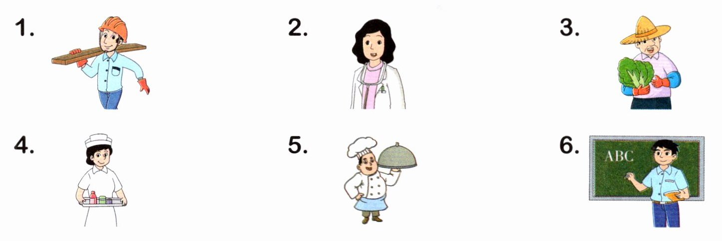 1. worker 2. doctor 3. farmer 4. nurse 5. cook 6. teacher