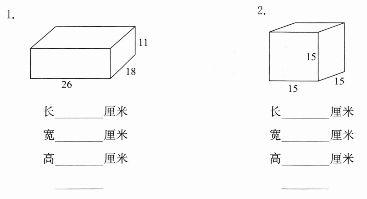 四、说出下列图形的长、宽、高各是多少,并指出该图形是长方体还是正方体(单位:厘米)