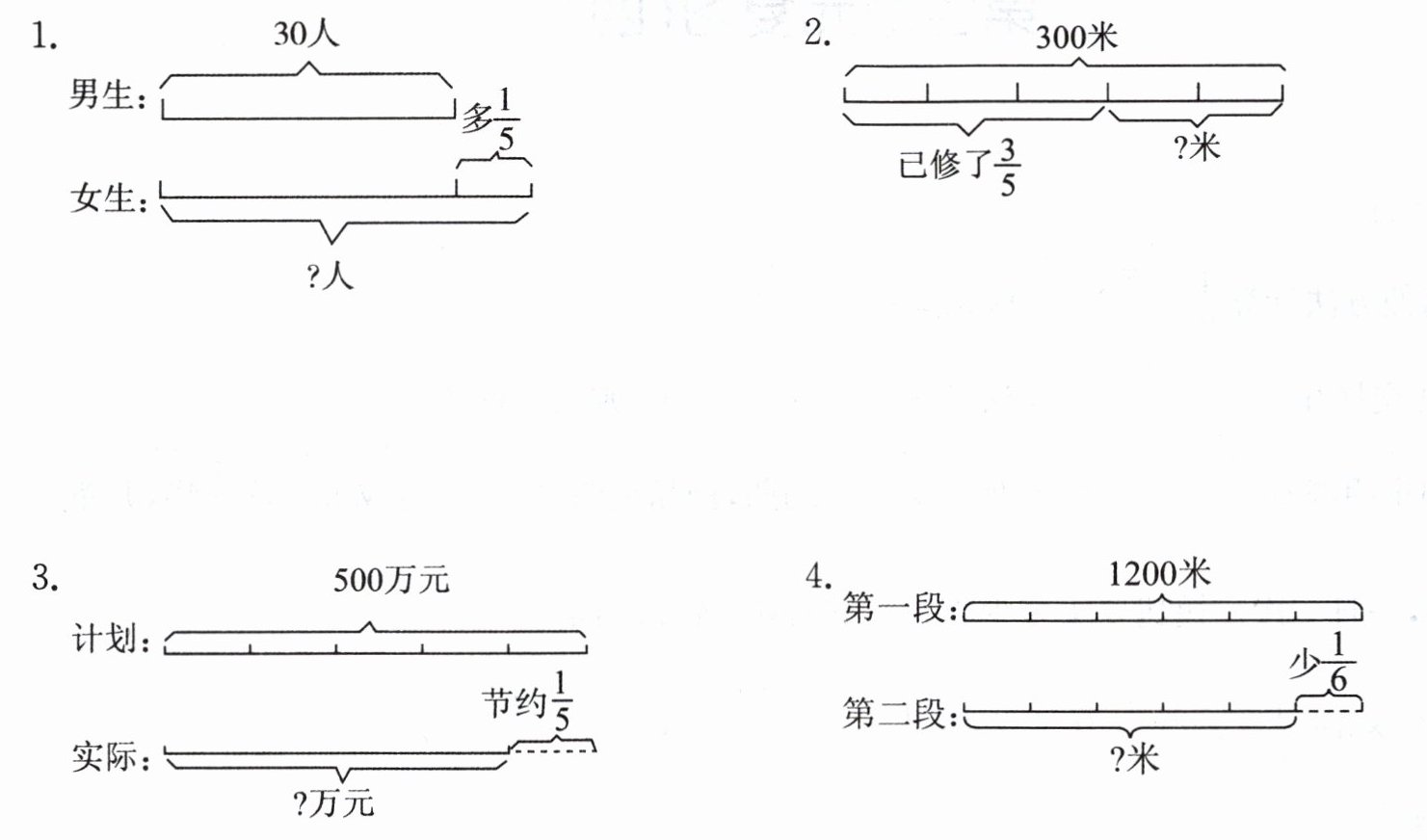 4. $1200×(1-\frac{1}{6})=1000$(米)