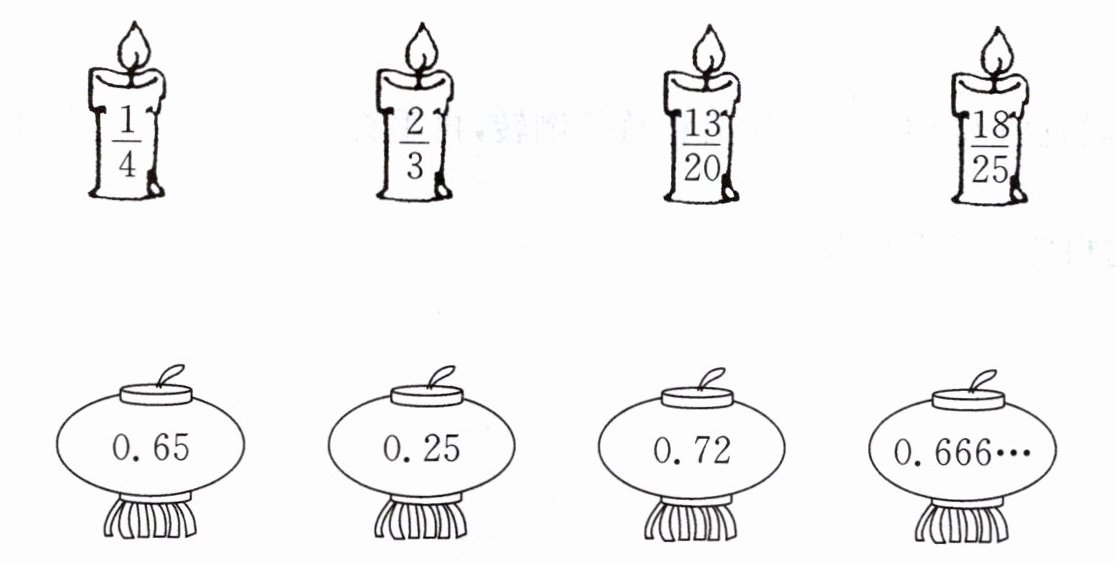 $\frac{1}{4}$与$0.25$相连;$\frac{2}{3}$与$0.666\cdots$相连;$\frac{13}{20}$与$0.65$相连;$\frac{18}{25}$与$0.72$相连。