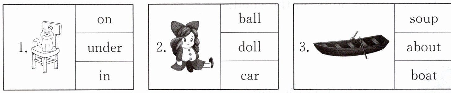 1. 圈 on 2. 圈 doll 3. 圈 boat 4. 圈 map 5. 圈 car