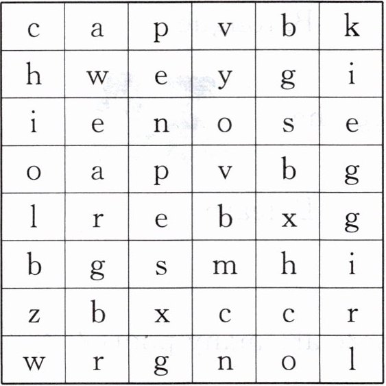 1. cap 2. pen 3. nose 4. egg 5. girl 6. long