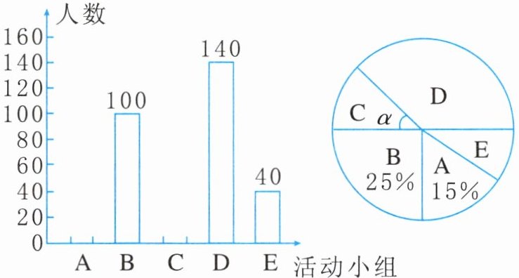 10. 某校为落实“双减”工作,增强课后服务的吸引力,充分用好课后服务时间,为学有余力的学生拓展学习空间,成立了5个活动小组(每位学生只能参加一个活动小组):A.音乐;B.体育;C.美术;D.阅读;E.人工智能.为了解学生对以上活动的参与情况,随机抽取部分学生进行了调查统计,并根据统计结果,绘制了下图所示的两幅不完整的统计图.