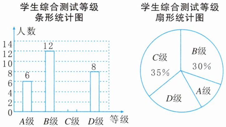 13. 某校为了解学生对“生命、生态与安全”课程的学习掌握情况,从八年级学生中随机抽取了部分学生进行综合测试. 测试结果分为 A 级、B 级、C 级、D 级四个等级,并将测试结果绘制成了如下两幅不完整的统计图. 根据统计图中的信息解答下列问题: