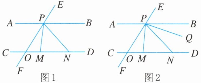 (2)如图2,射线 PQ 为$∠MPE$的平分线,用等式表示$∠NPQ与∠POM$之间的数量关系,并说明理由.