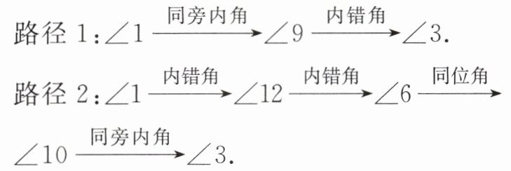 (1)路径:$∠1\xrightarrow{内错角}∠12\xrightarrow{同旁内角}∠8$。