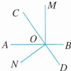 13. 如图,直线 $ AB $,$ CD $ 相交于点 $ O $,$ \angle BOD $ 和 $ \angle AON $ 互余,$ \angle AON = \angle COM $。