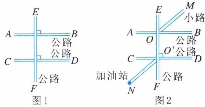 (2)如图2,在(1)的条件下,若小路$OM平分∠EOB$,通往加油站$N的岔道O'N平分∠CO'F$,试判断$OM与O'N$的位置关系,并说明理由.
