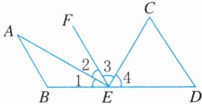 ∴ $\angle 2 = \angle 1 = \frac{1}{2} \angle BEF$,$\angle 3 = \angle 4 = \frac{1}{2} \angle DEF$。