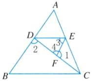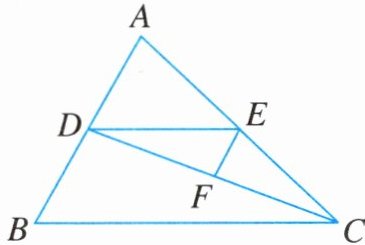 $\therefore\angle B=\angle ADE.\therefore DE// BC.\therefore\angle AED=\angle ACB$。