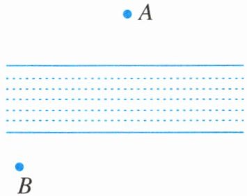 14. 如图,A,B两地之间有一条小河,现在想在河岸搭一座桥(桥与河岸垂直),要使从点A处过桥到点B处的路程最短,应搭在什么地方?请在图中画出示意图.