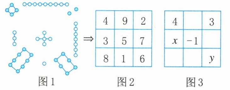 9. 我国古代夏禹时期的“洛书”(图1所示),就是个三阶“幻方”(图2所示).观察图1、图2,我们可以寻找出“九宫图”中各数字之间的关系,在显示部分数据的新“幻方”(图3所示)中,根据寻找出的关系,可推算出$y^{|x|}$的值为____.