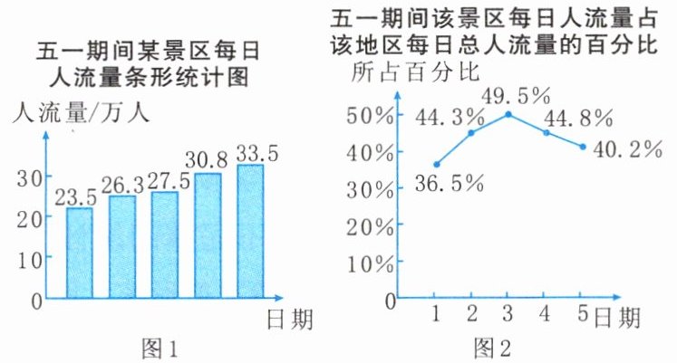 5. 某景区在五一期间每日的人流量如图1所示,该景区的每日人流量占该地区每日总人流量的百分比如图2所示.下列说法错误的是()