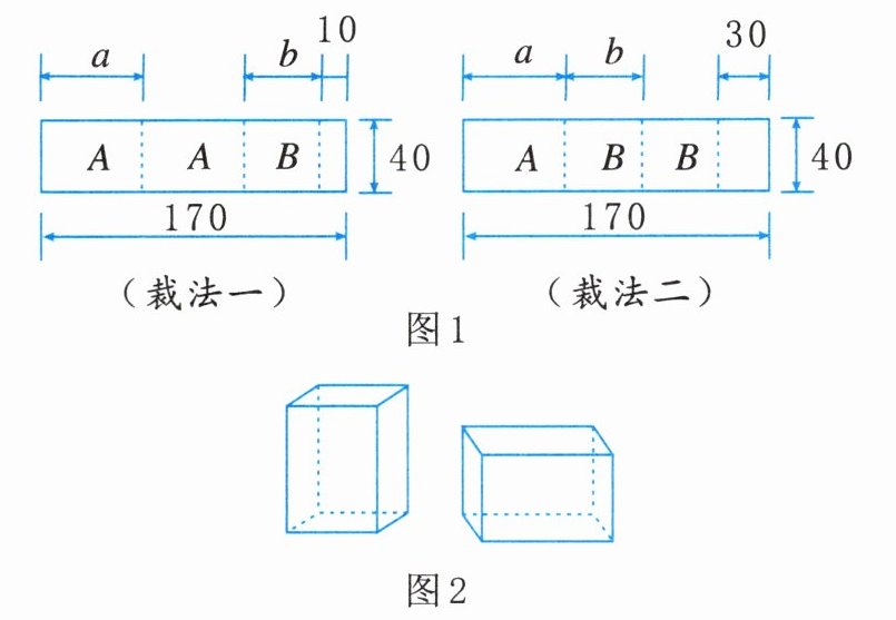 14. 我市某包装生产企业承接了一批礼品盒制作业务,为了确保质量,该企业进行试生产.他们购得规格是 170 cm×40 cm 的标准板材作为原材料,每张标准板材再按照裁法一或裁法二裁下 $ A $ 型与 $ B $ 型两种板材,如图 1(单位:cm).