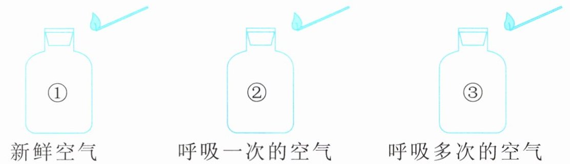 收集三瓶气体,分别是新鲜空气、呼吸一次的空气、呼吸多次的空气,将三根点燃的火柴分别放入瓶中(如下图所示)。