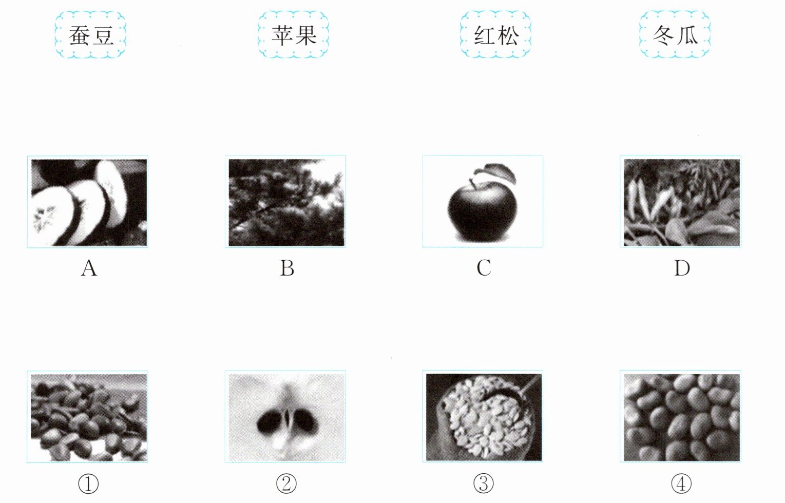 把下列植物的名称与相应的图片以及种子连接起来。